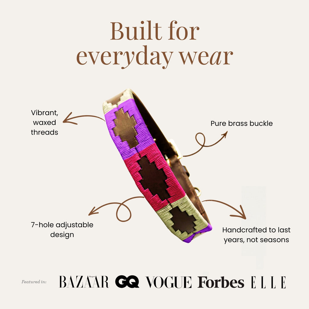 ICONIC ARTISAN CRAFTSMANSHIP — Experience the authentic spirit of South America. Each Carlos Diaz collar is meticulously hand-woven by master artisans using the finest waxed threads to create our iconic Pampa patterns. We honour centuries-old Gaucho traditions to produce vibrant, multi-coloured embroidery that is both a piece of art and a functional accessory.